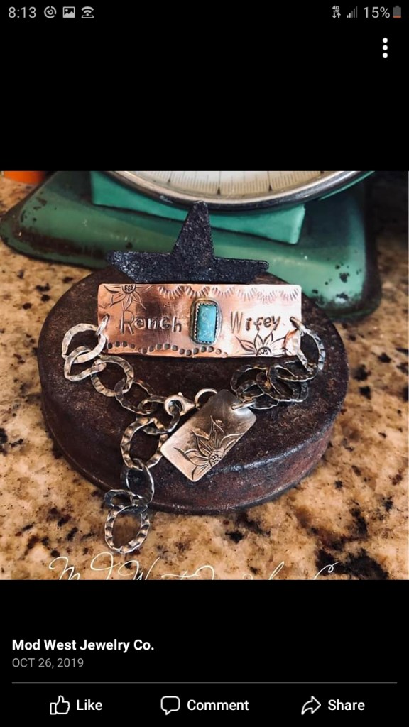 I had been watching Mod West Jewelry getting started and I knew that I just had to have a piece so I did what every good ranch wife does and dropped the not so subtle hint to Corey that I our anniversary was coming up and that I really liked this Ranch Wife bracelet that Mod West had with a screenshot of what I liked. Well lucky for me he took the hint and what Robin and him designed and then she created blew me away. The detail and love that she put into the piece is just amazing. I love how she added our brand in a little tag and that it has a pretty flower on the back. My favorite part though is in the back it says “the first of many”. This bracelet is something that I will have forever and it is so classy that it will always be in style.