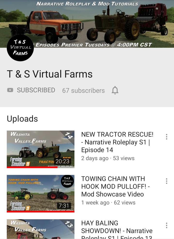 What is T&S Virtual Farms? It’s a YouTube show that takes place in Farming Simulator 19. The show is basically a fictional vlog of college student named Cussler Roberts while he is home for the summer. While he is home he takes you along with him on his jobs with the local COOP, working some odd and end’s jobs for other farmers and some of his own farming for his family and self.