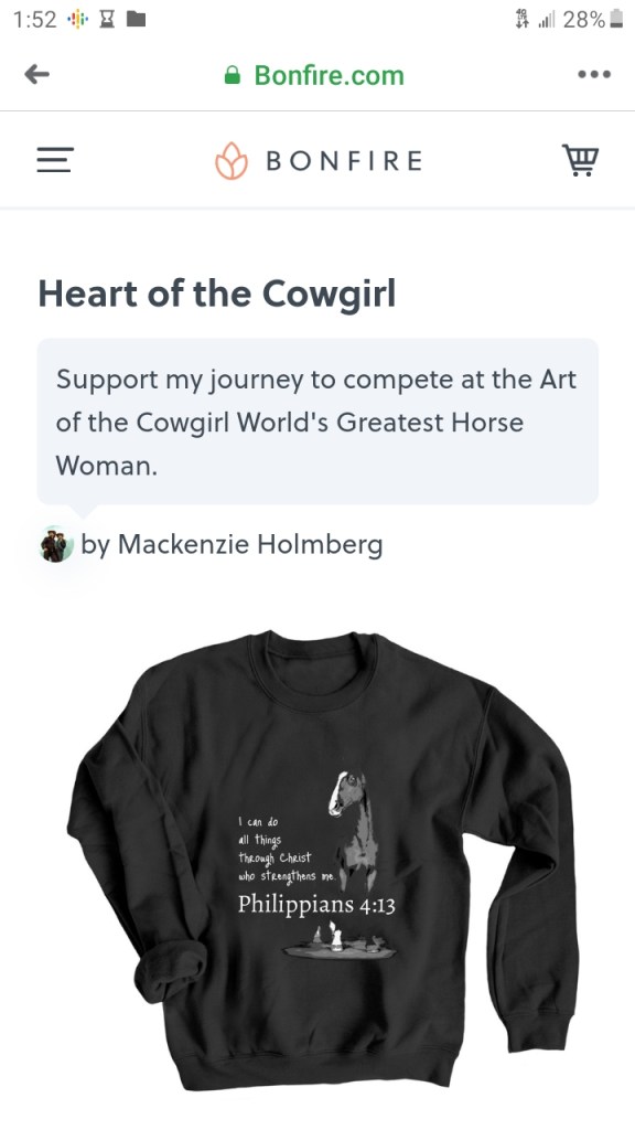 Another opportunity to help was ordering a sweatshirt from a friend that is heading to the Art of the Cowgirl Worlds Greatest Horsewoman. I know it takes so much work and dedication to accomplish this and a huge shot of courage to enter.