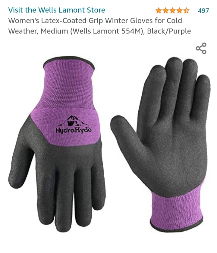 My husband got some of the men’s Well’s Lamont gloves with the coating on the fingers and palm as a gift and after using them for a season couldn’t say enough good things about them so I bought him a backup pair and I debated about buying a pair for myself. I finally broke down and bought myself a pair and I wish that I hadn’t drug my feet so long. They are less then $15 off Amazon and sometimes you can find them at feed stores. The coating on the palm and fingers makes them pretty water proof and help you grip things. They are lined so that they keep your hands nice and toasty. What I like most of all is that they fit a lot like a roping glove so they stretch to fit your hands instead of being super big and bulky or too small. Oh, and they are a very stylish purple color. (pretty excited to be sporting my Alma Mater’s colors)